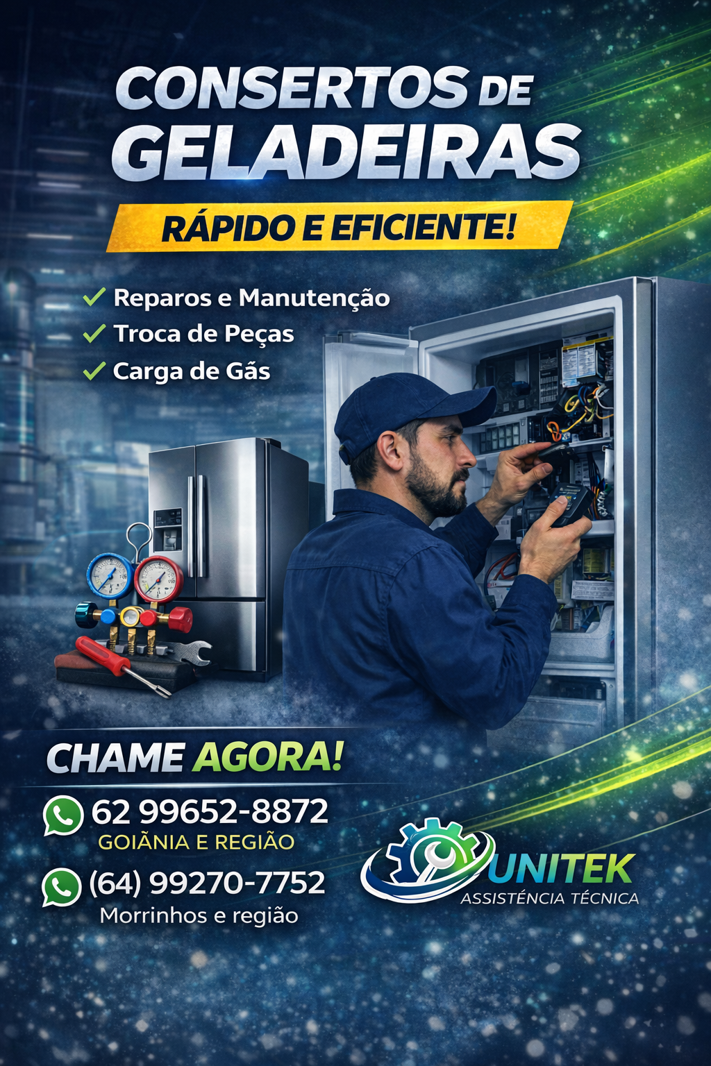 Na Unitek, o foco não é apenas “trocar peças”, mas devolver a eficiência do seu eletrodoméstico. Atendemos Goiânia e Aparecida com a seriedade de quem sabe que uma geladeira cheia não pode esperar
